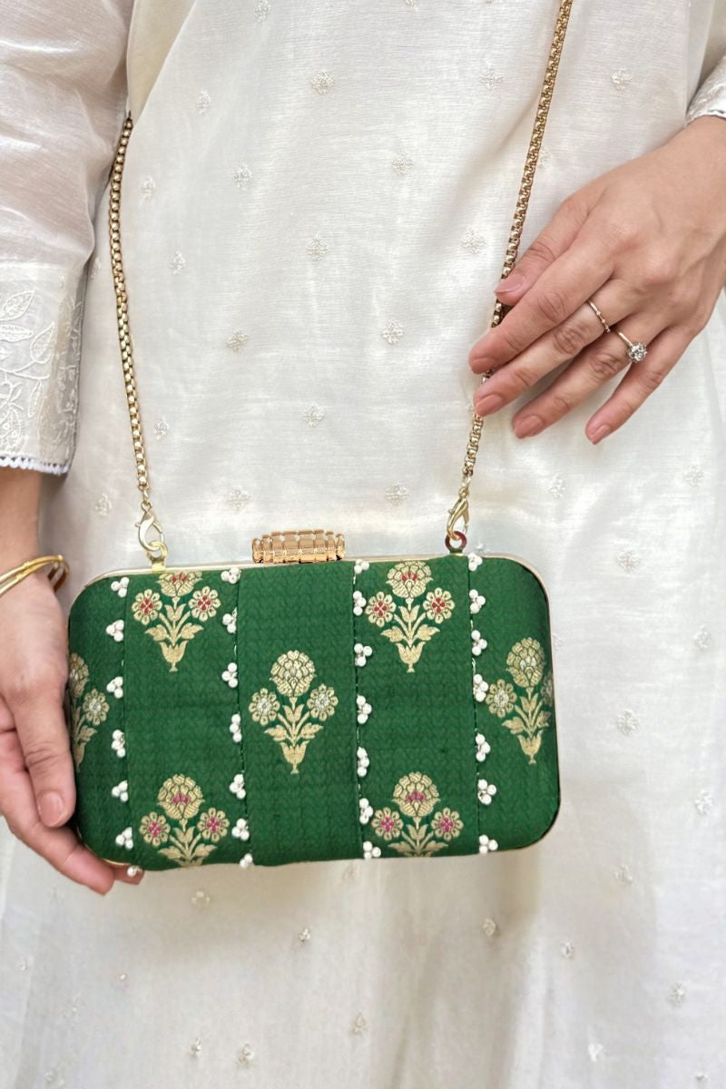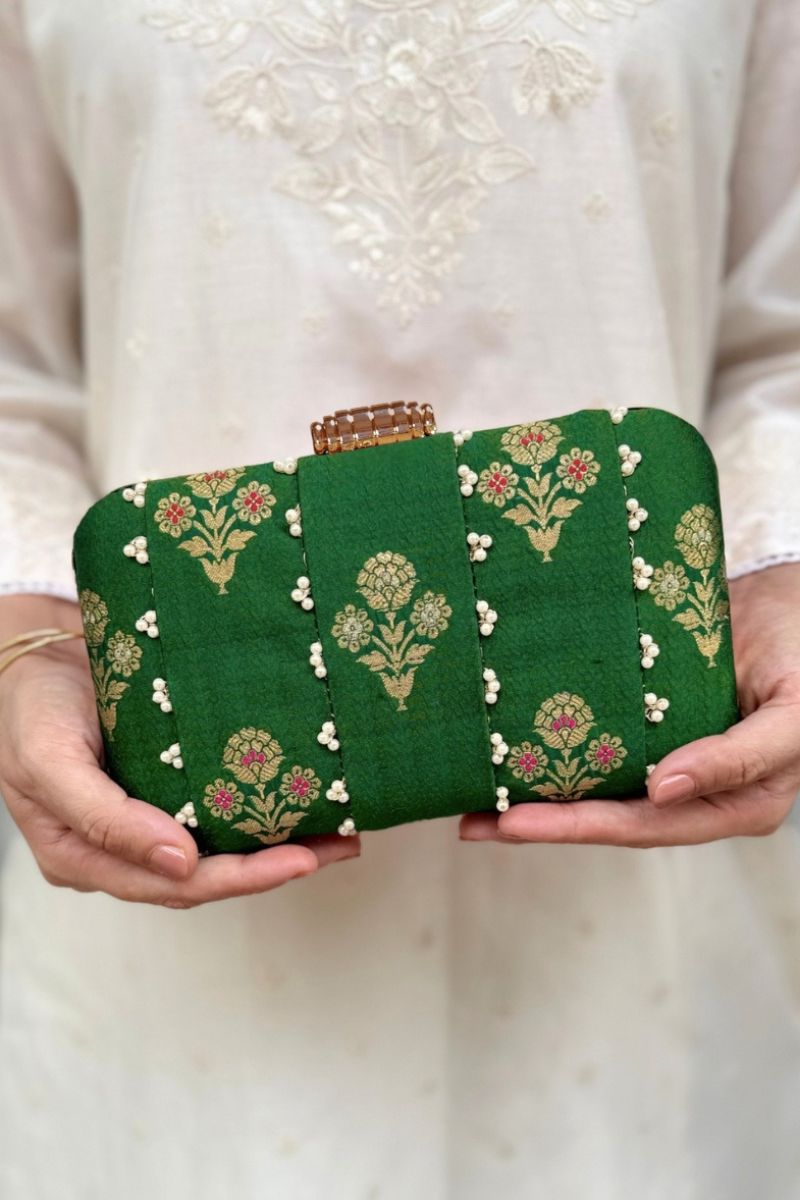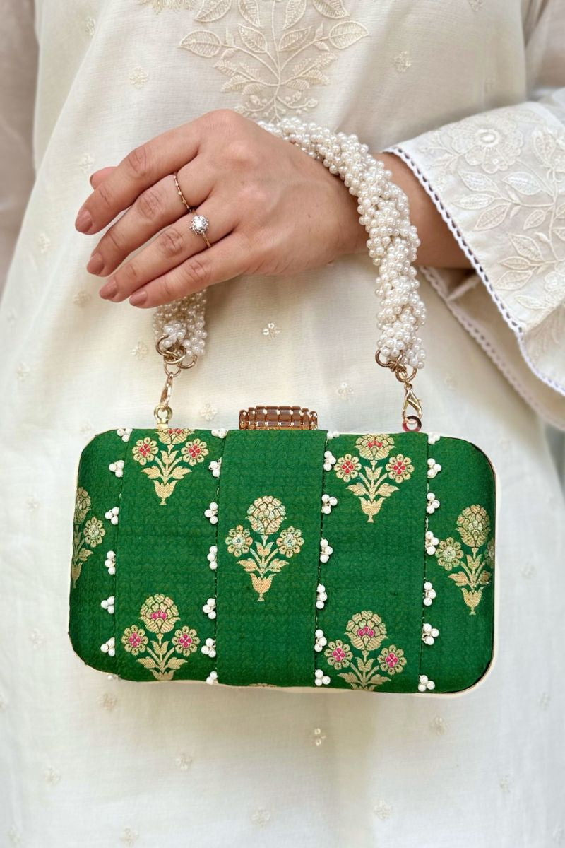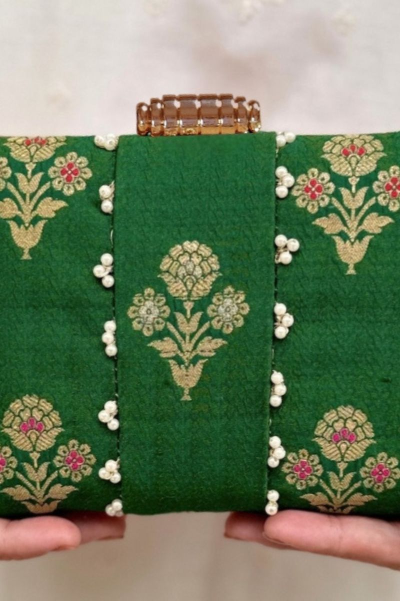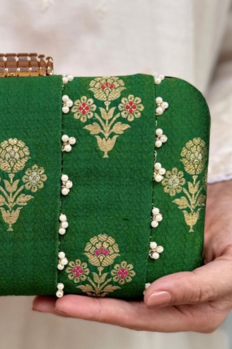 A timeless statement of elegance, Bahaar pure silk green clutch features delicate pearl embellishments and intricate floral zari motifs that exude luxury. Perfect for weddings and festive occasions, its refined craftsmanship and rich texture make it a must-have accessory to complement any traditional or contemporary look.