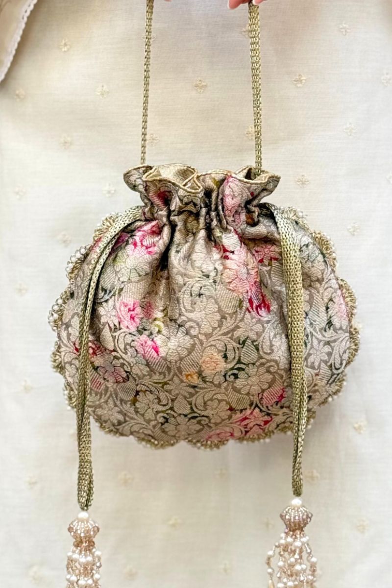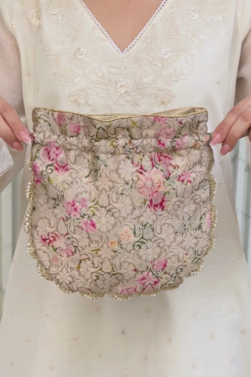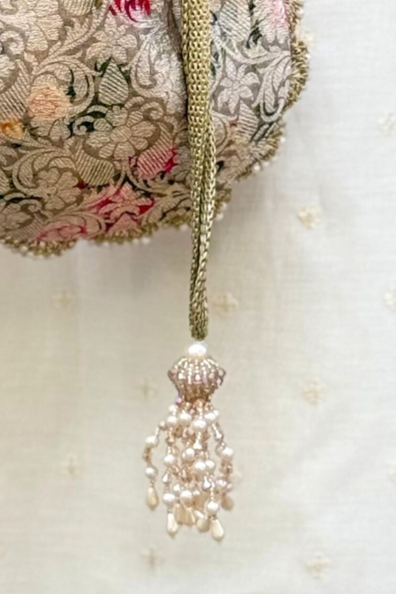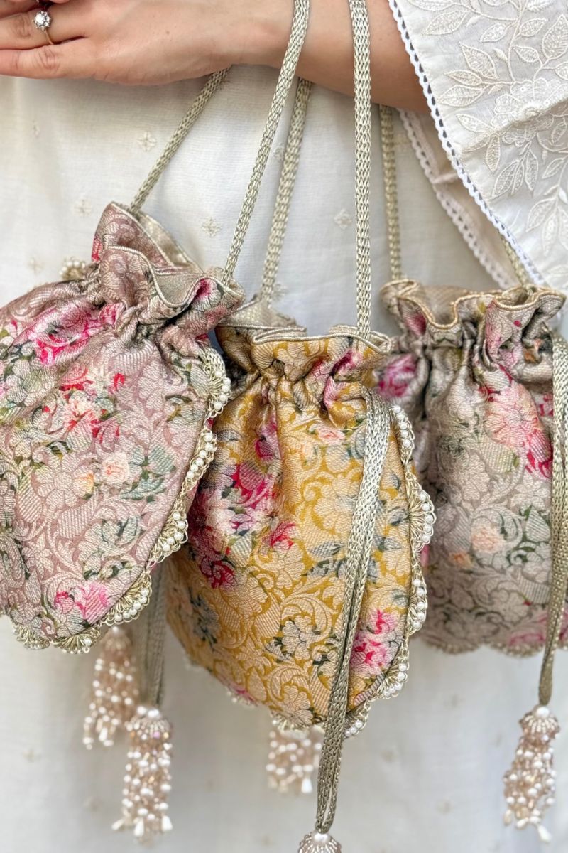 Crafted in pure Banarasi silk, Elora potlis are adorned with delicate scallop lace and elegant pearl embellishments. Finished with beautiful pearl and crystal bead tassels, they bring a timeless, luxurious charm, perfect for weddings and festive occasions.