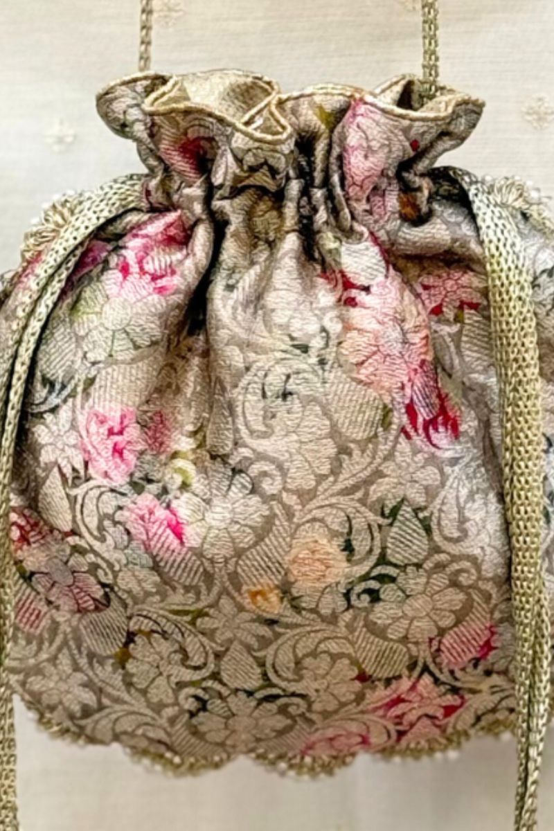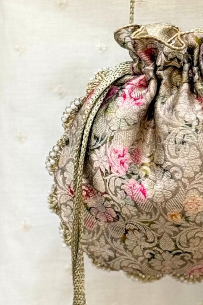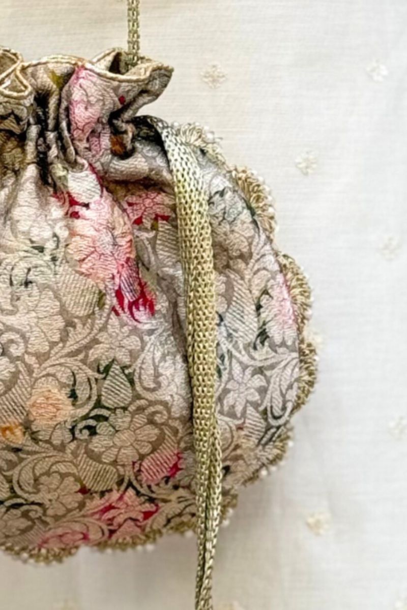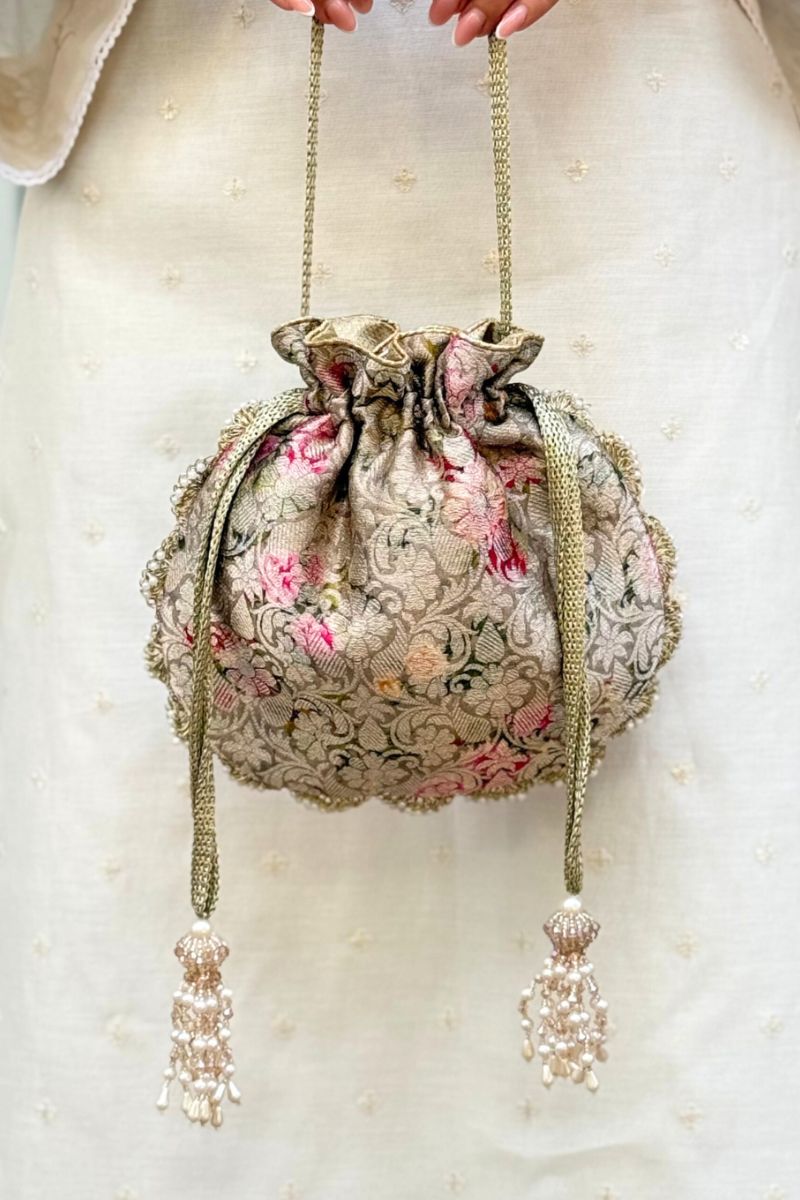 Crafted in pure Banarasi silk, Elora potlis are adorned with delicate scallop lace and elegant pearl embellishments. Finished with beautiful pearl and crystal bead tassels, they bring a timeless, luxurious charm, perfect for weddings and festive occasions.