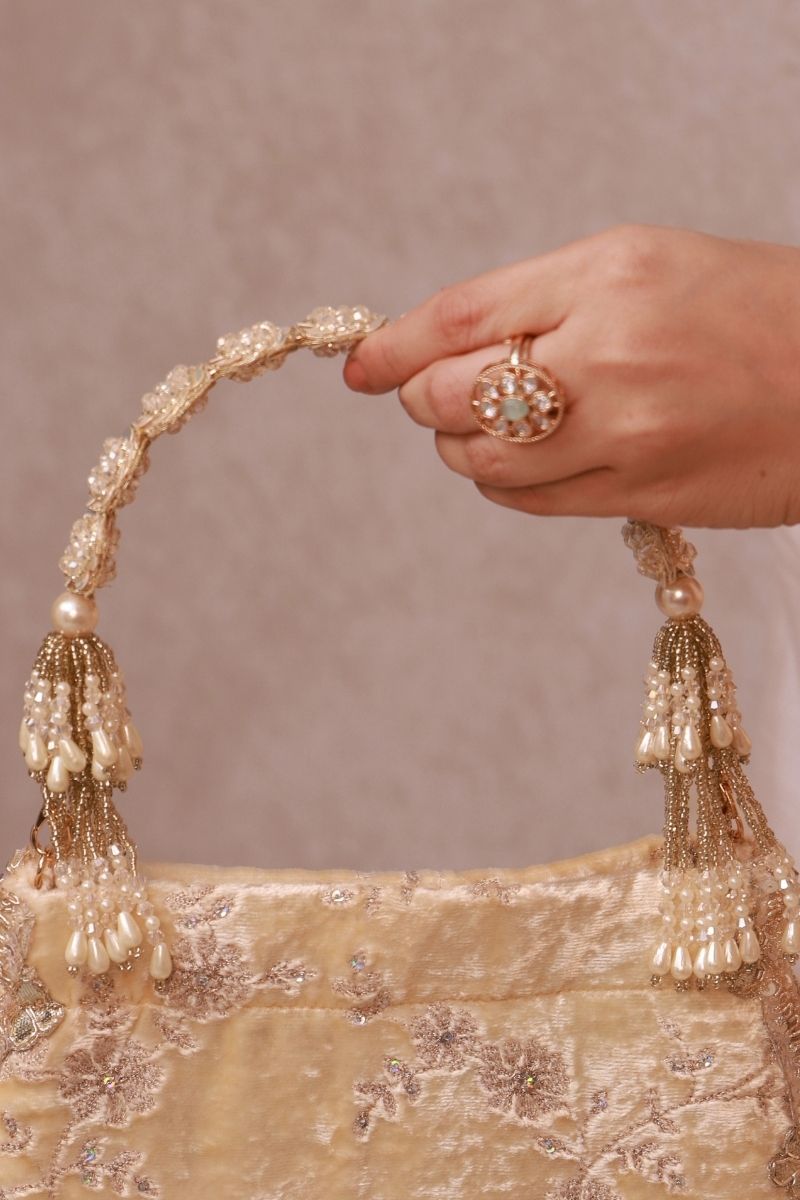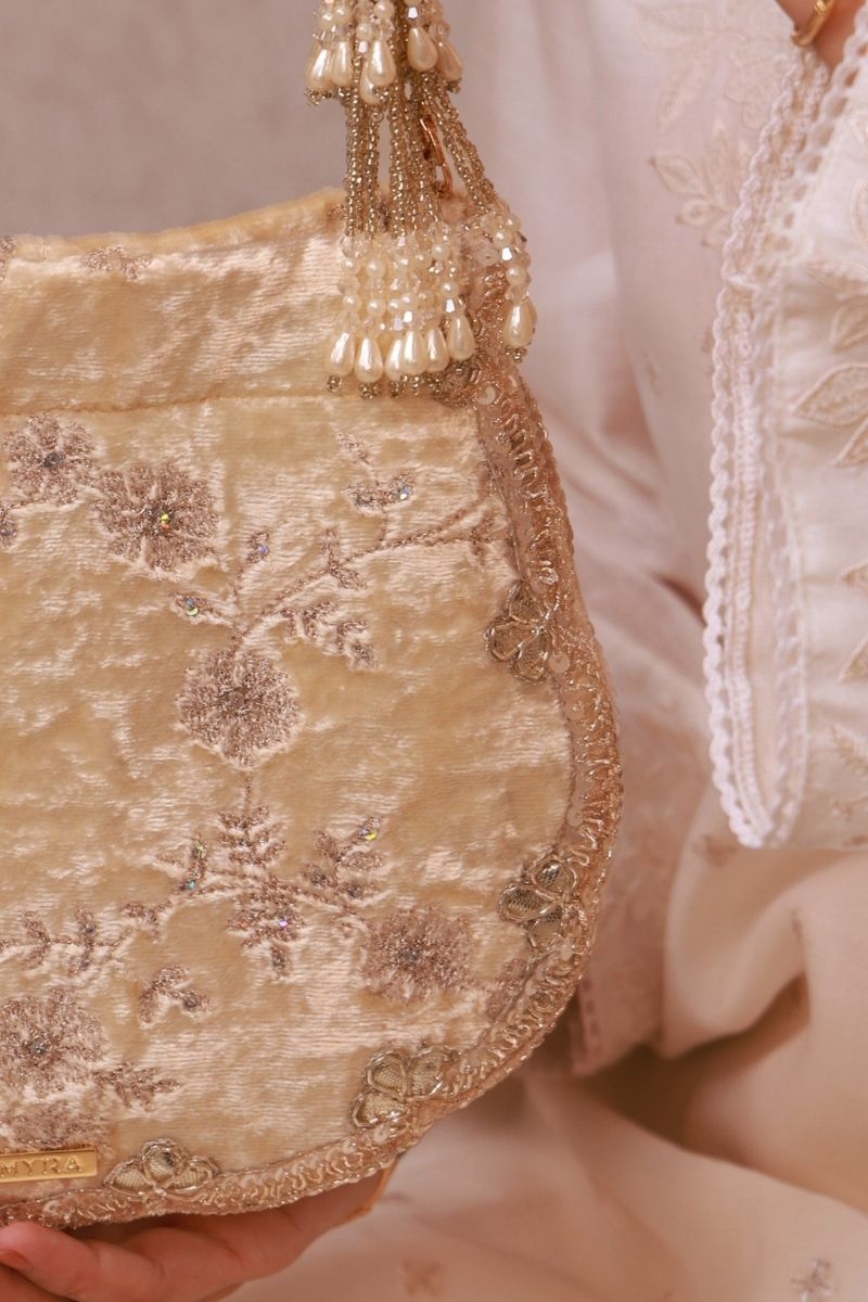 Graceful and feminine, the Suki Velvet Scallop Embroidered Purse is crafted in plush velvet with a soft sheen that adds richness to every ensemble. The scallop borders is highlighted with delicate embroidered and subtle bead detailing, creating an elegant balance of texture and shimmer. Finished with intricately embellished and handcrafted handle and tassels, this purse offers both charm and functionality
