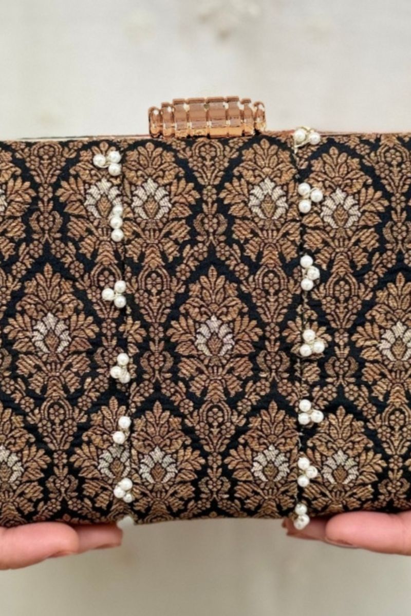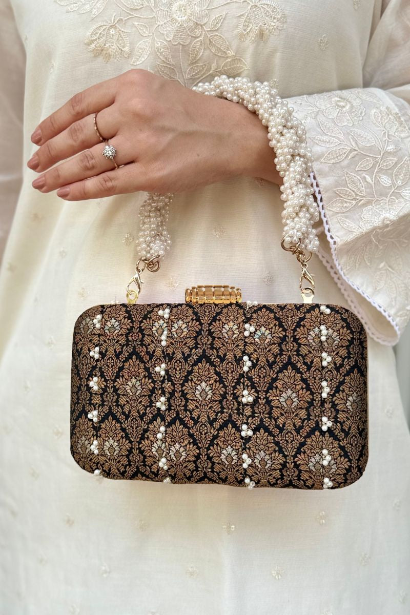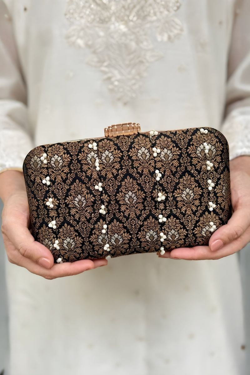 Sukoon is crafted from classic black pure silk, enhanced with antique gold zari motifs for a timeless appeal. The panels are beautifully accented with a delicate three-pearl lace, creating a sophisticated accessory perfect for weddings, festive occasions, or evening events.