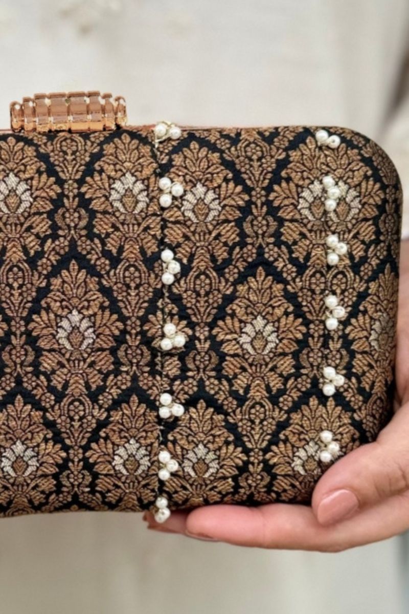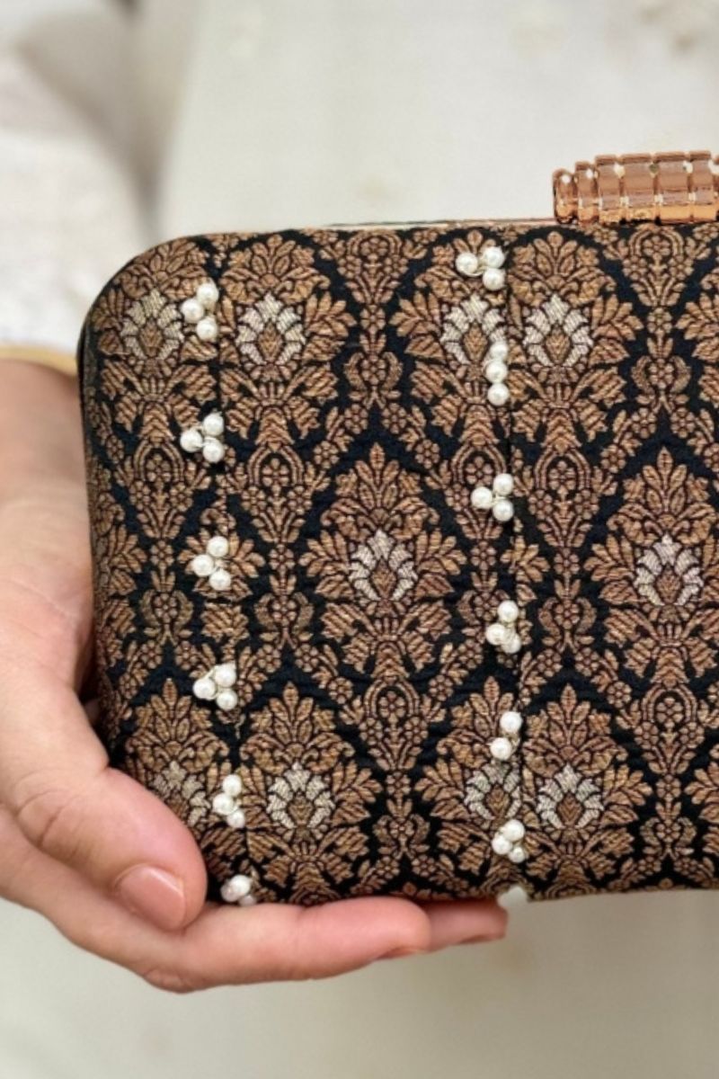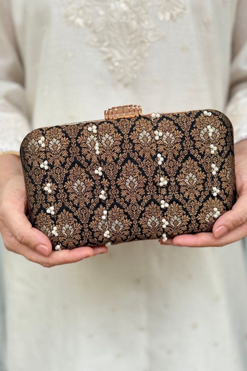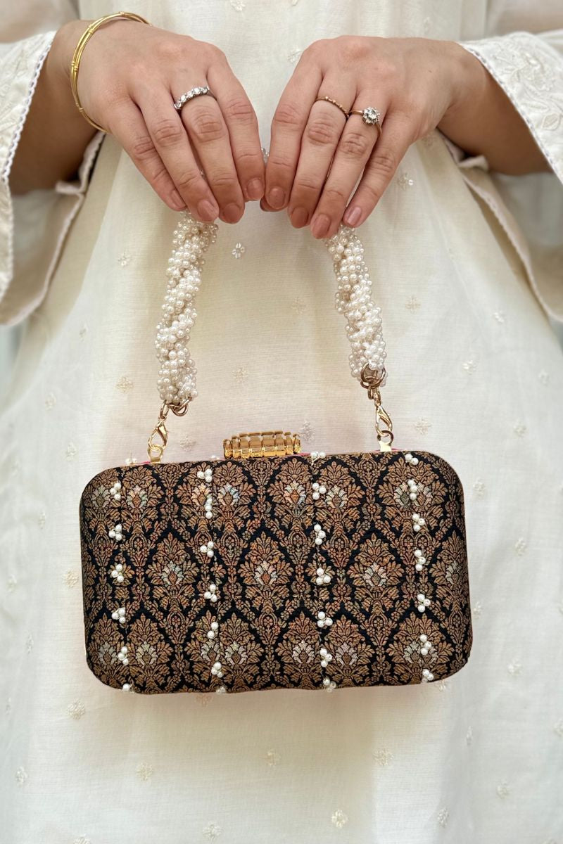Sukoon is crafted from classic black pure silk, enhanced with antique gold zari motifs for a timeless appeal. The panels are beautifully accented with a delicate three-pearl lace, creating a sophisticated accessory perfect for weddings, festive occasions, or evening events.