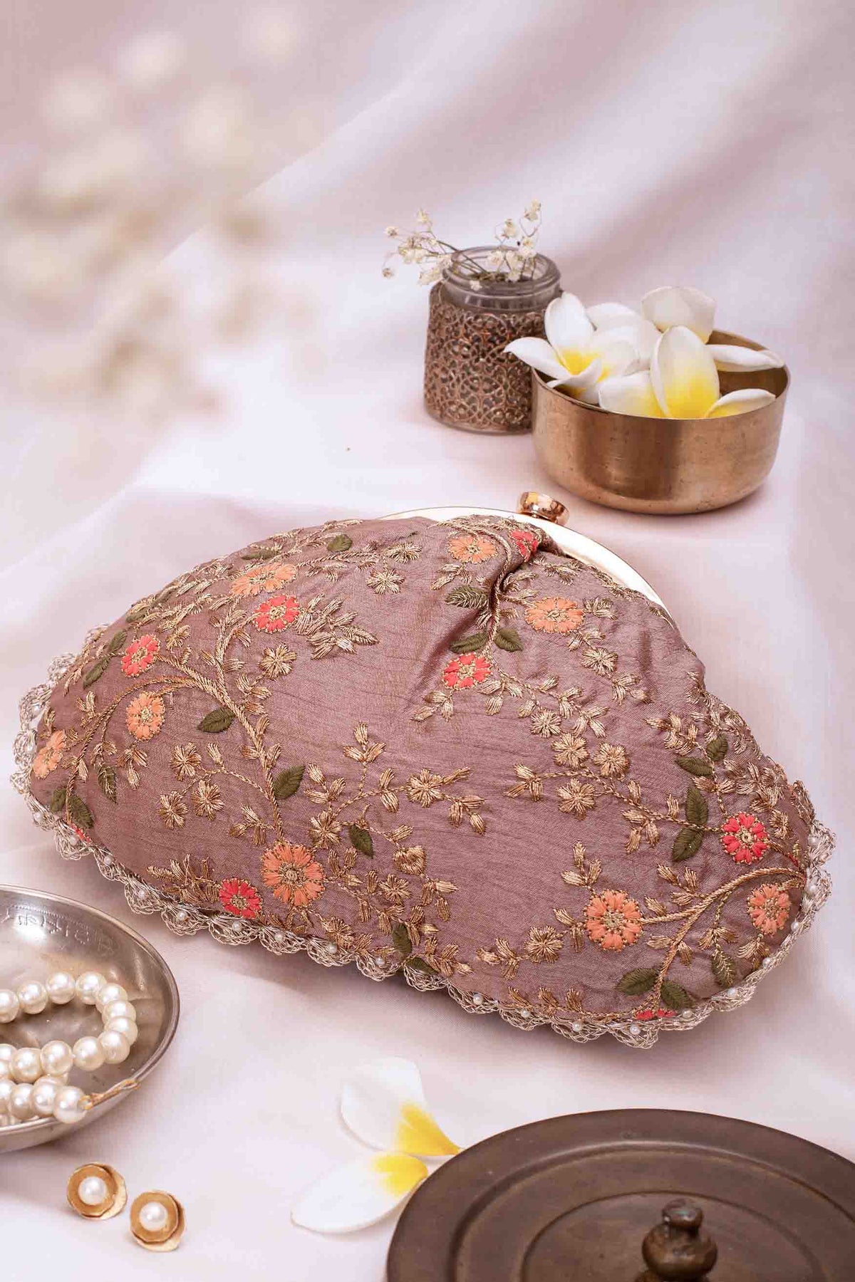 This set contains 2 cream, 2 red, 2 black, 2 pink, 2 grey floral creeper vintage purses each packed in a gold tissue dust bag. You can opt for additional box packaging by choosing the 'Gold dust bag + AMYRA box packaging' variant.