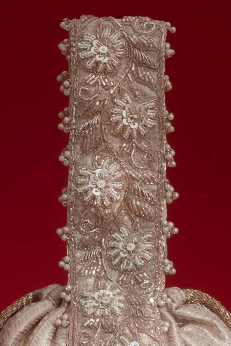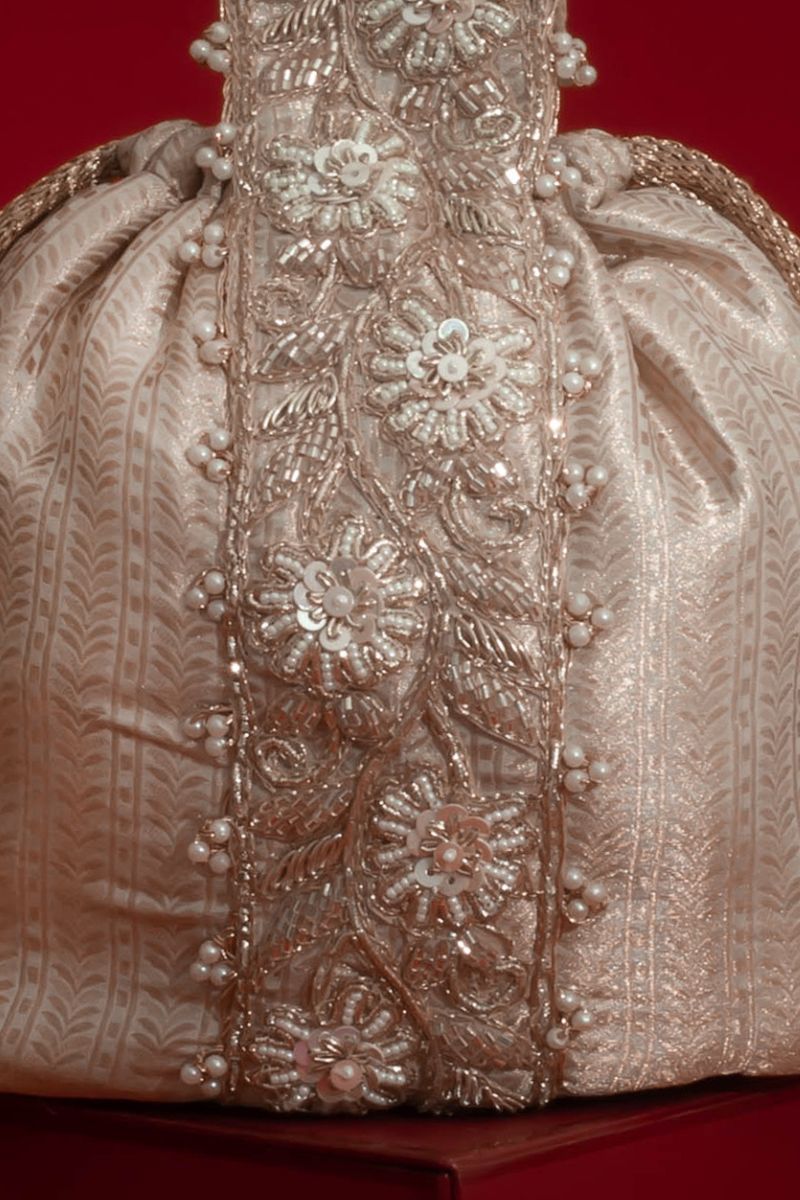 • Material: Organza tissue fabric, poly satin lining, woven silver lace drawstring, hand embroidered handle and cutdana tassels