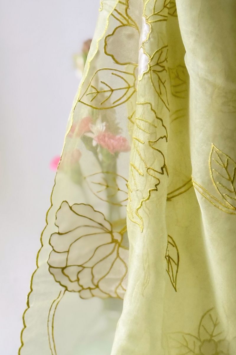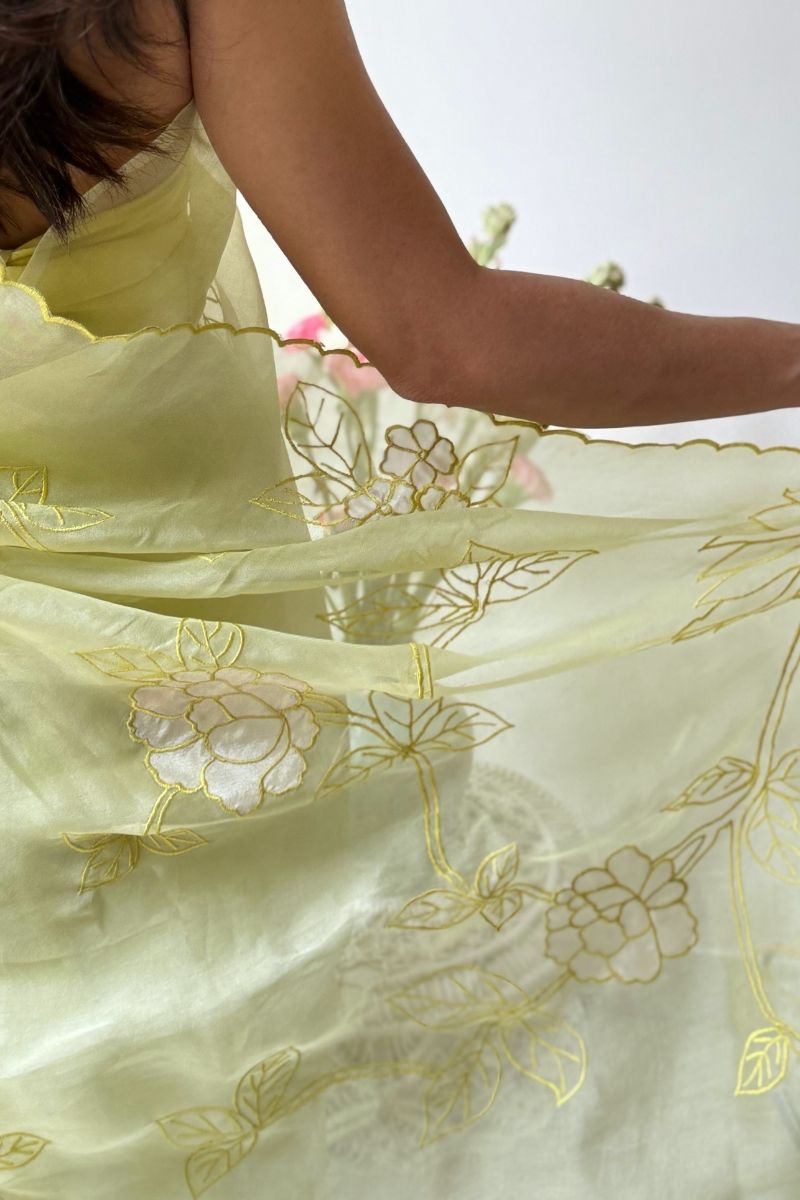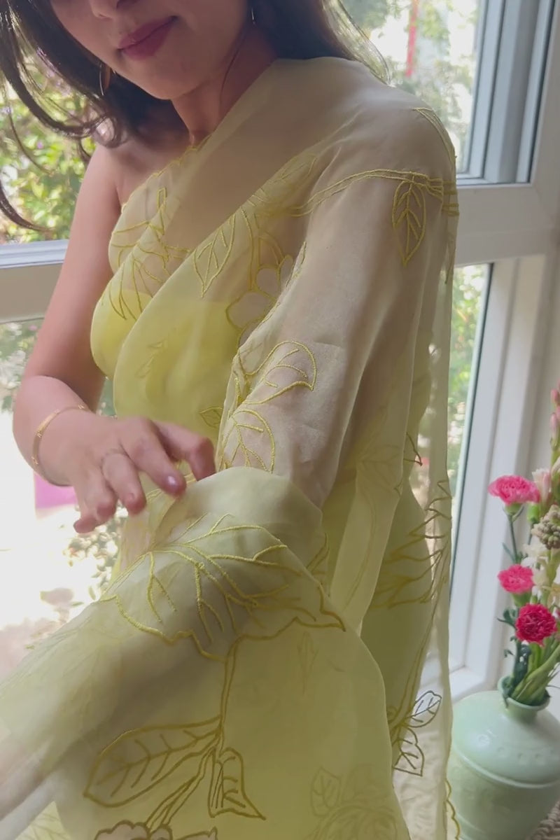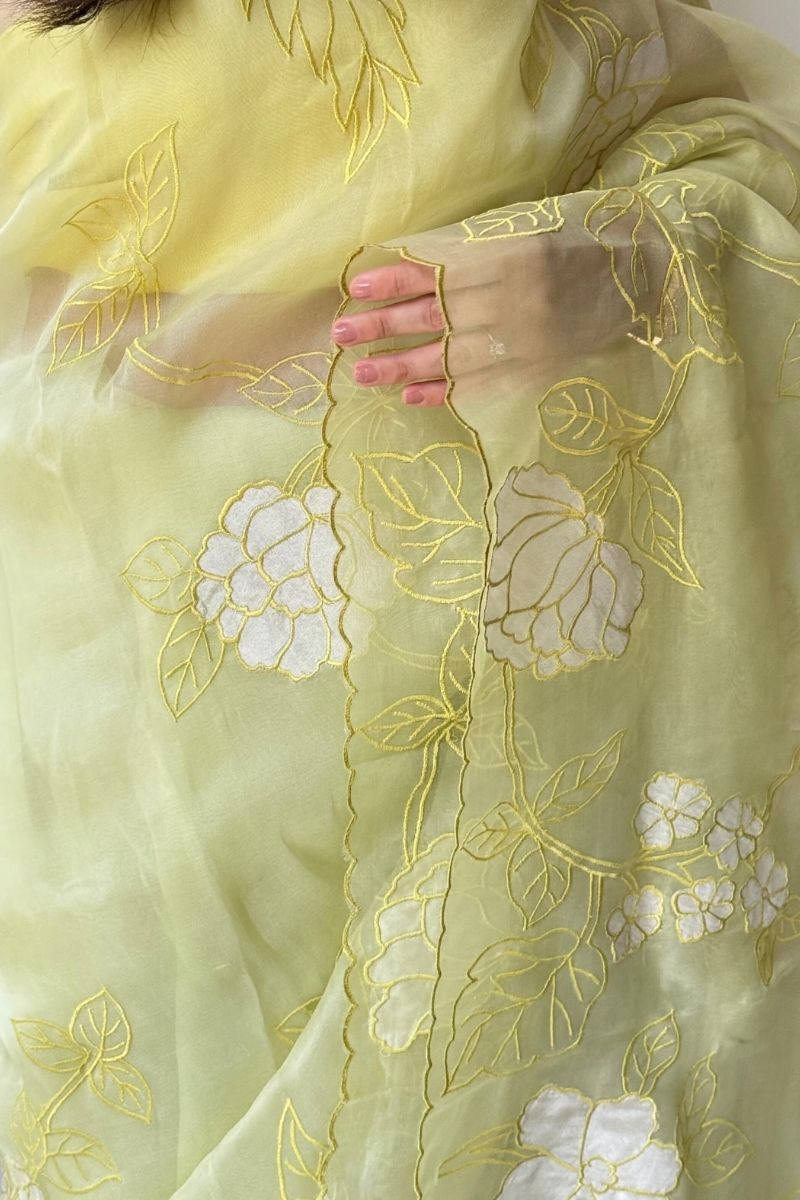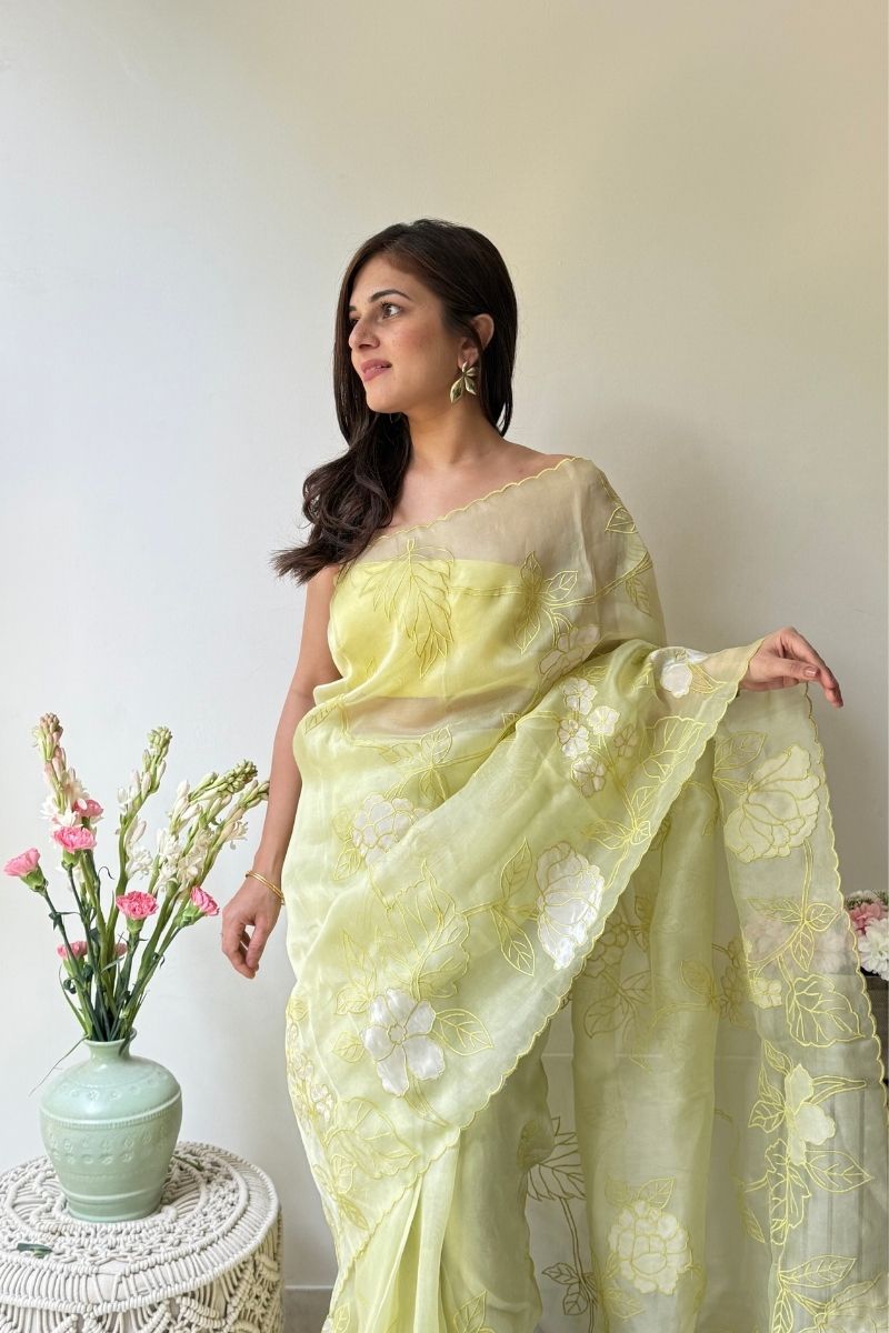 Refined and artistic, the Ekaa Pure Organza Silk saree is an expression of contemporary elegance. Crafted in sheer, lightweight organza, it features delicately placed appliqué motifs that are meticulously hand-finished, creating subtle contrast, texture, and depth.