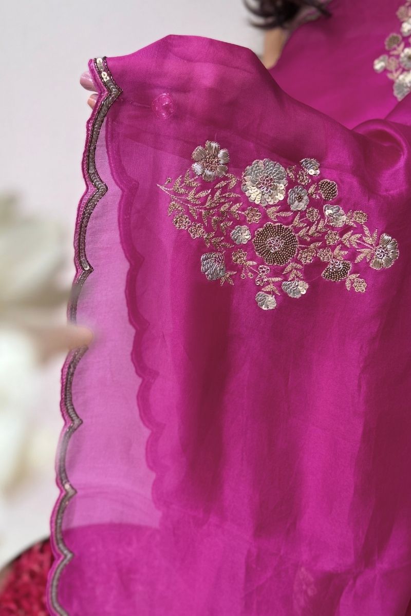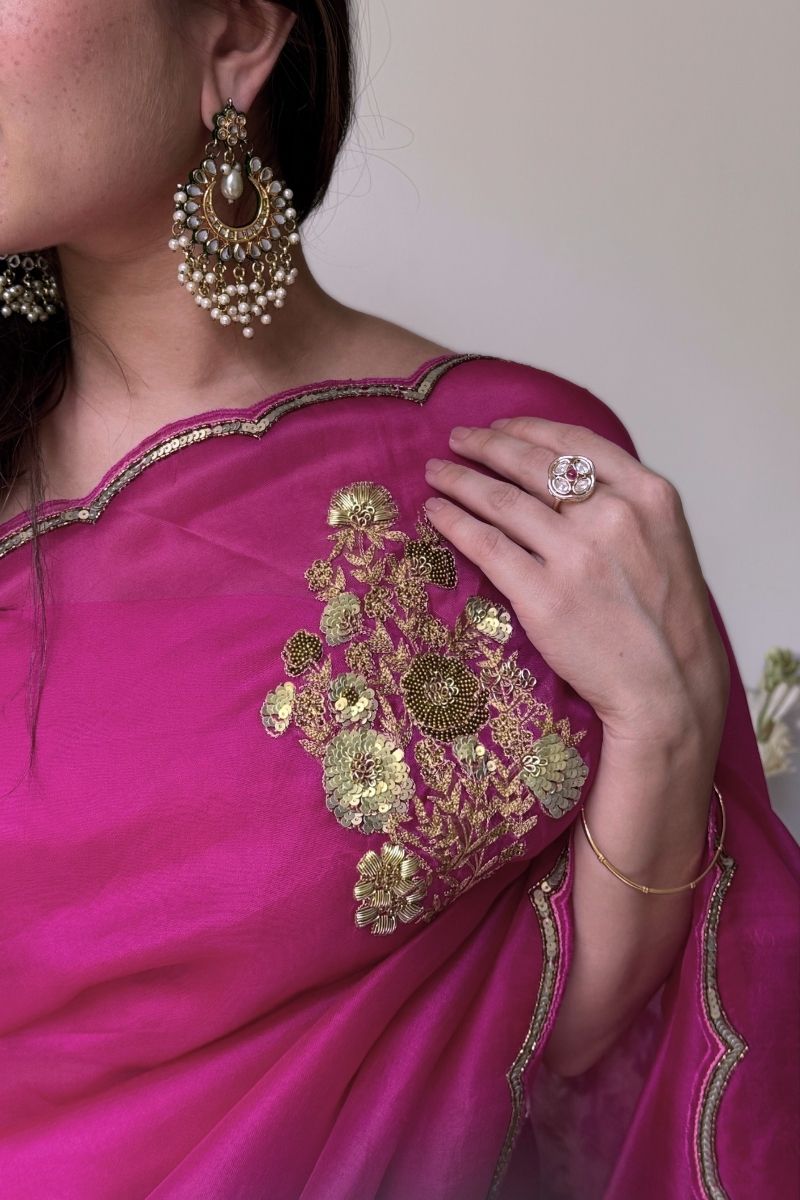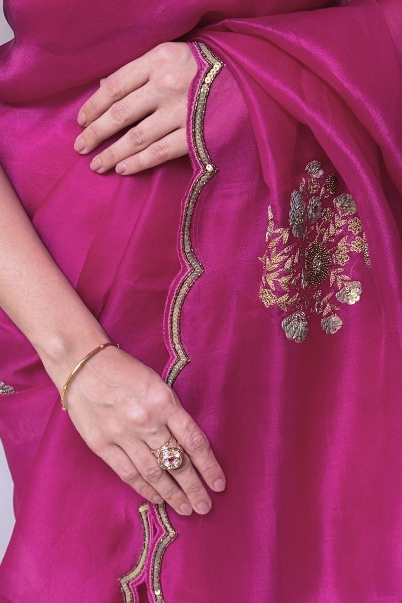 Elegant and ethereal, the Mehar Pure Organza Silk saree is a celebration of fine craftsmanship. Crafted in lightweight organza, it features delicate hand-embroidered ticky butas that add subtle texture and shimmer while preserving the fabric’s airy grace. A timeless saree, perfect for refined festive moments and elegant daytime wear.