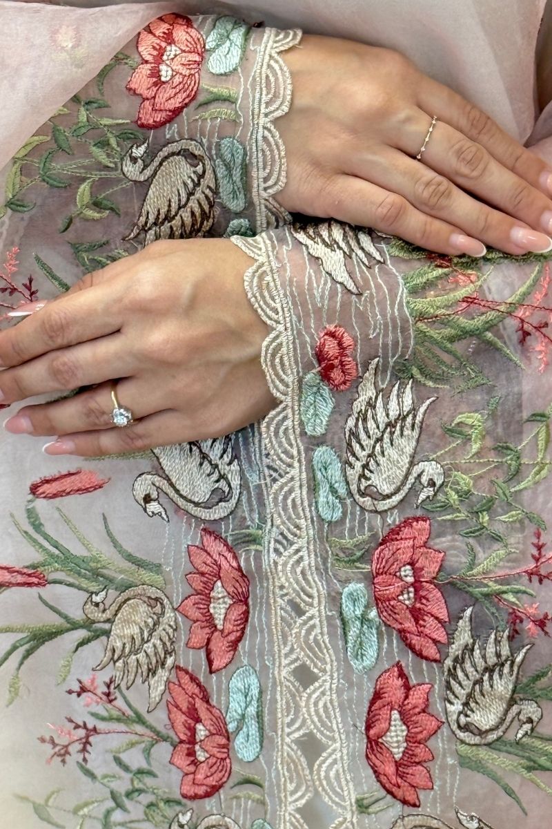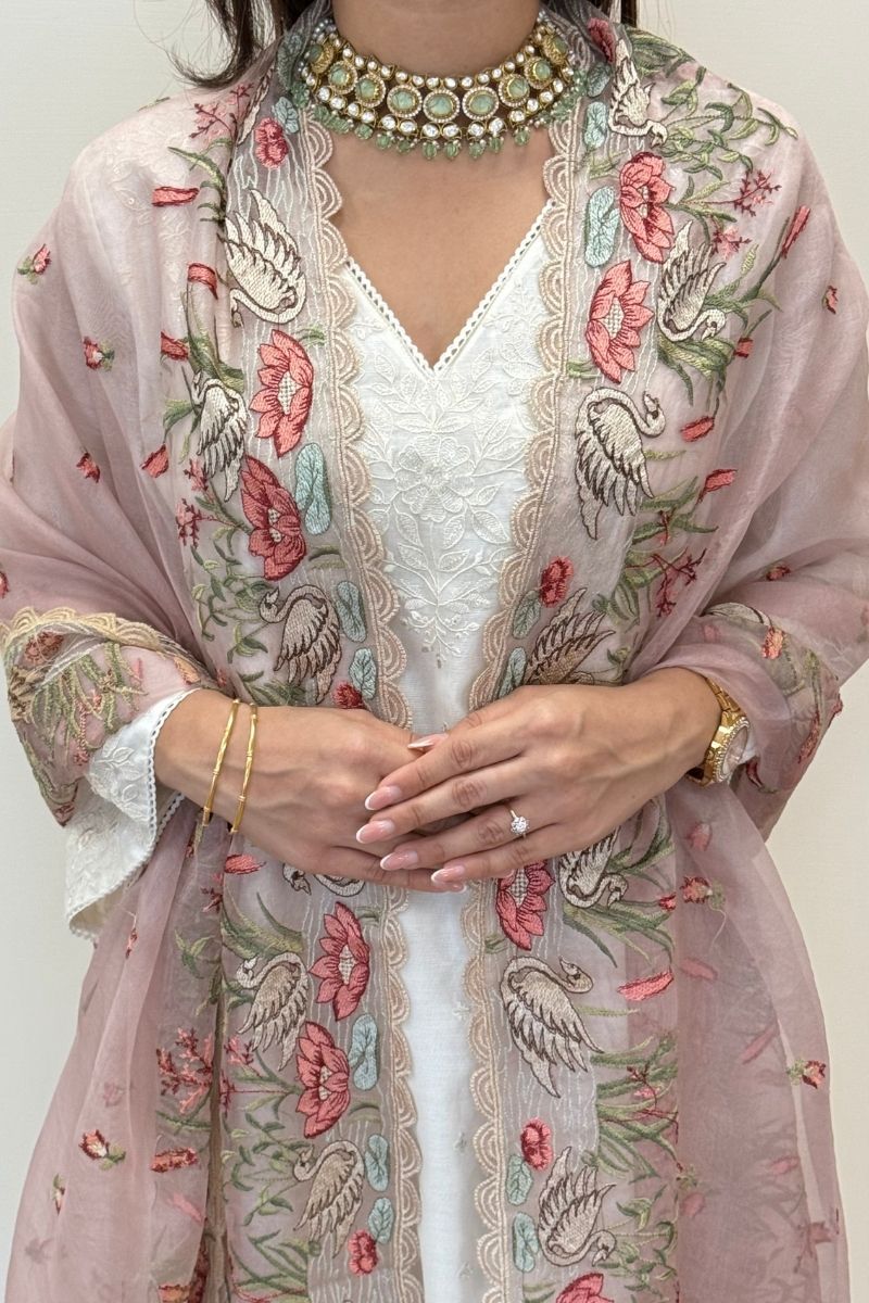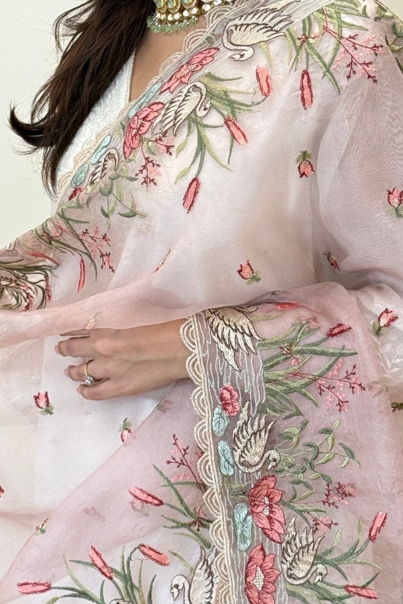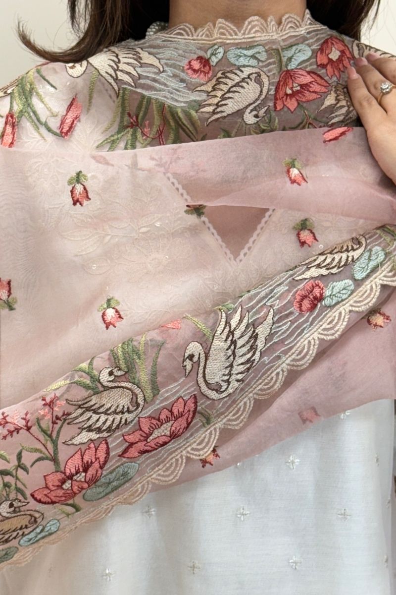 Delicate, dreamy, and effortlessly elegant, the Mirari Dupatta is crafted from lightweight Kora organza and beautifully detailed with fine thread embroidery. The soft, sheer fabric adds a touch of grace, while the scallop edge finish lends a refined, feminine flair. Perfect for special occasions, this dupatta drapes beautifully and complements both traditional and contemporary outfits with ease.