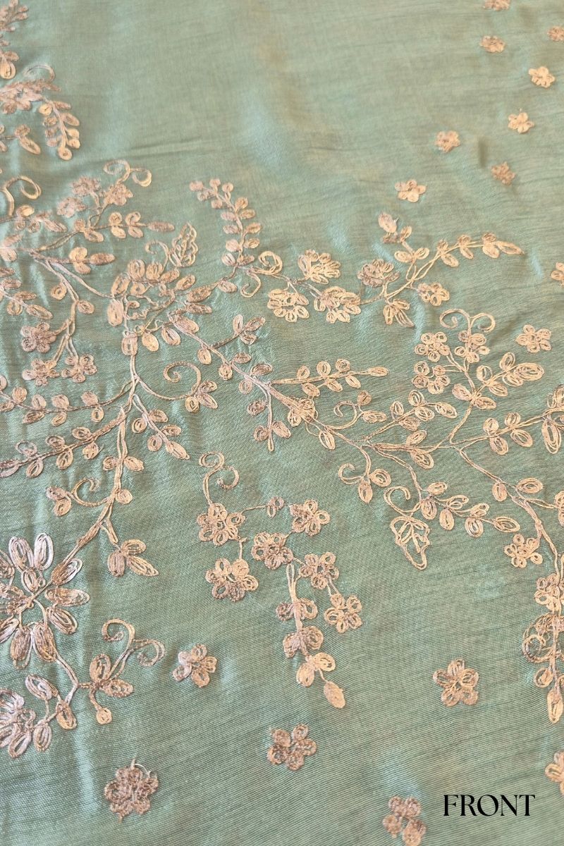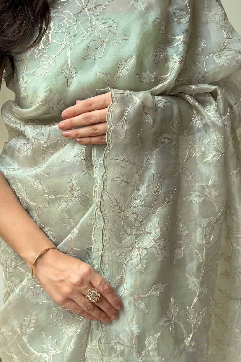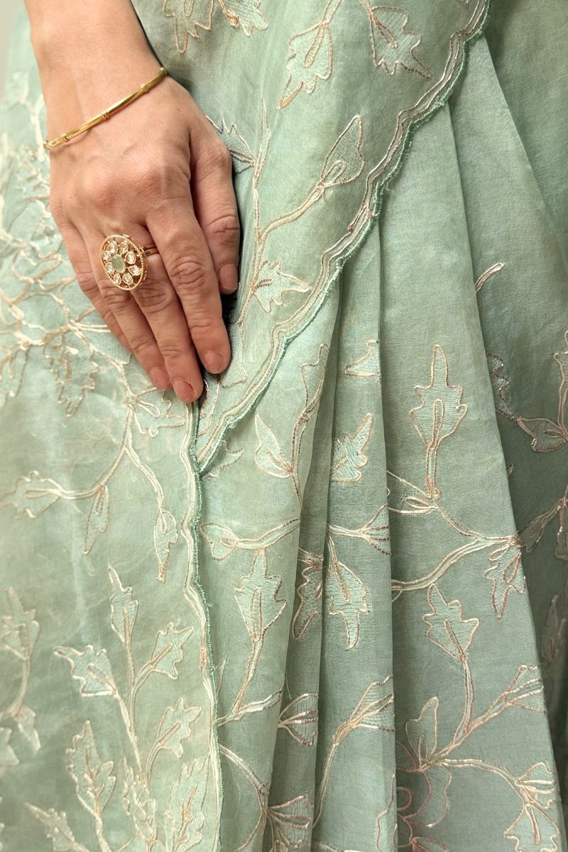 Fresh and ethereal, the Ruh Pure Organza Silk saree is crafted in a serene mint hue that highlights the fabric’s sheer elegance. The saree features exquisite hand-embroidered pitta work, where fine metallic strips are delicately shaped and secured by hand to create intricate motifs with a soft, luminous finish. This meticulous technique adds dimension and gentle shimmer while keeping the overall look light and refined.