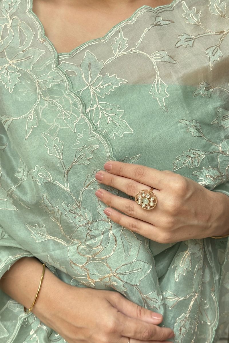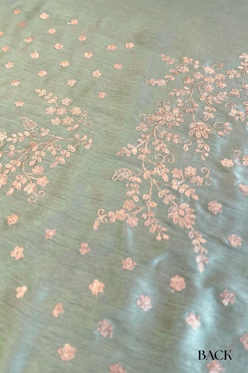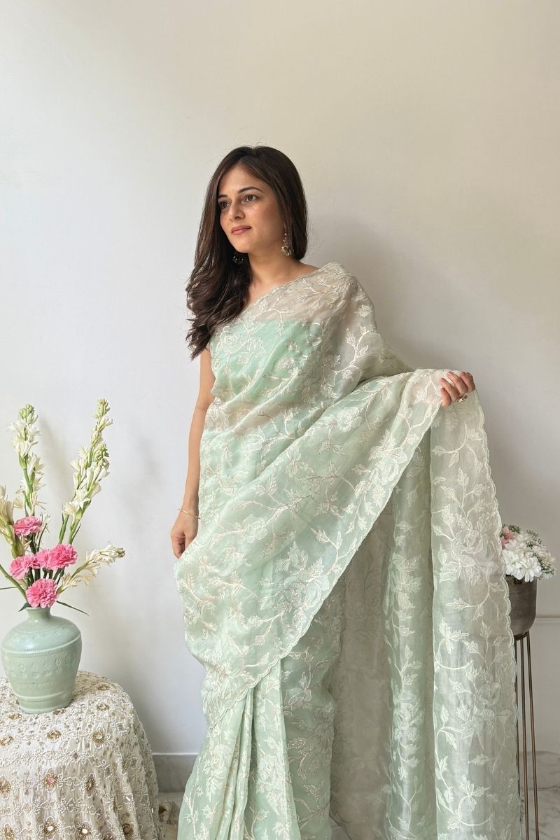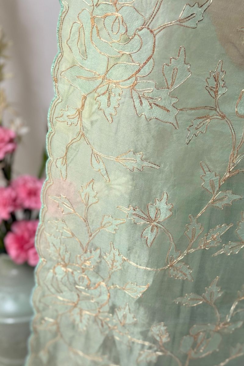 Fresh and ethereal, the Ruh Pure Organza Silk saree is crafted in a serene mint hue that highlights the fabric’s sheer elegance. The saree features exquisite hand-embroidered pitta work, where fine metallic strips are delicately shaped and secured by hand to create intricate motifs with a soft, luminous finish. This meticulous technique adds dimension and gentle shimmer while keeping the overall look light and refined.