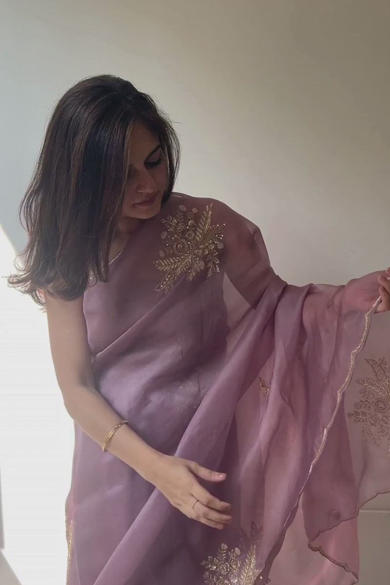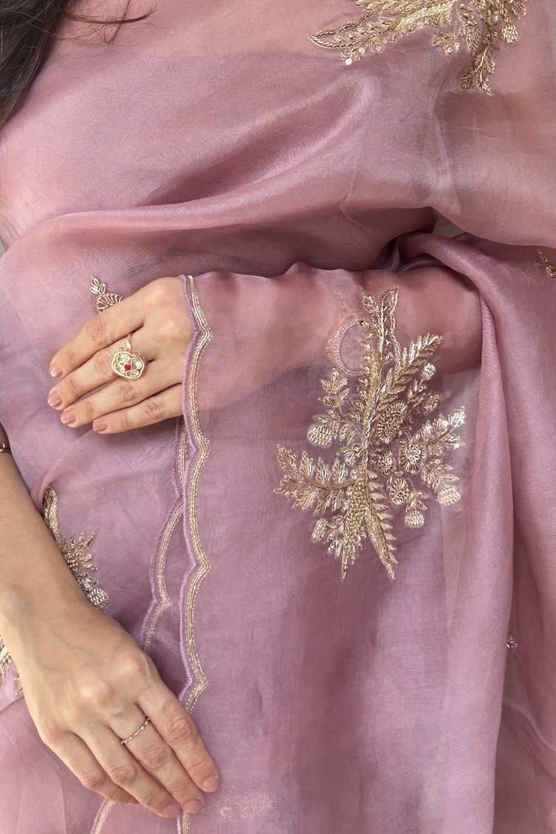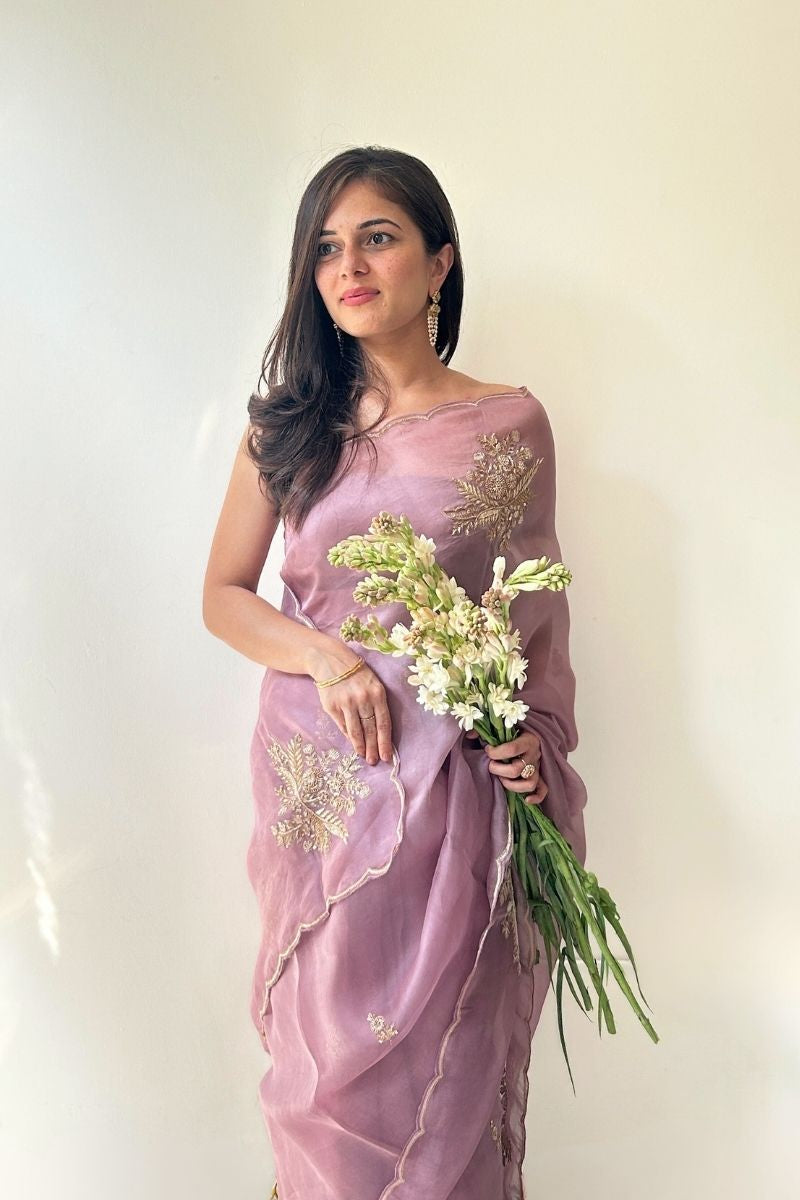 Graceful and luminous, the Saaz Pure Organza Silk saree is crafted in a soft lilac hue that enhances its sheer, airy drape. The saree features finely hand-embroidered zardozi butas, where metallic threads are intricately worked into delicate floral and foliage motifs, creating depth, texture, and a subtle regal sheen.