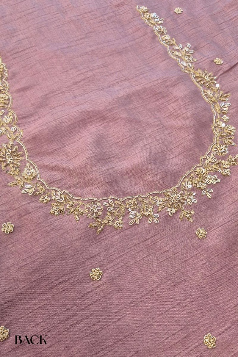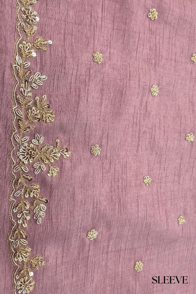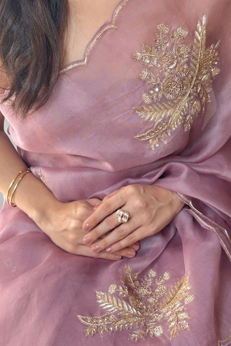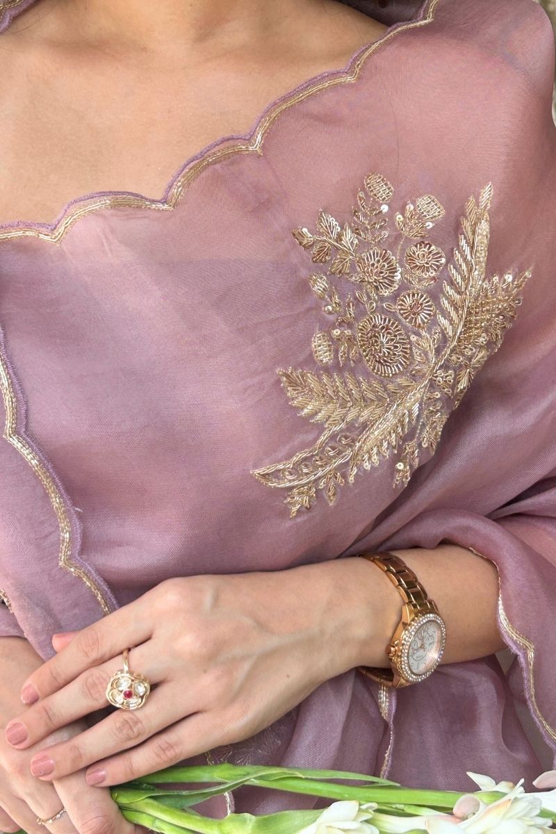 Graceful and luminous, the Saaz Pure Organza Silk saree is crafted in a soft lilac hue that enhances its sheer, airy drape. The saree features finely hand-embroidered zardozi butas, where metallic threads are intricately worked into delicate floral and foliage motifs, creating depth, texture, and a subtle regal sheen.