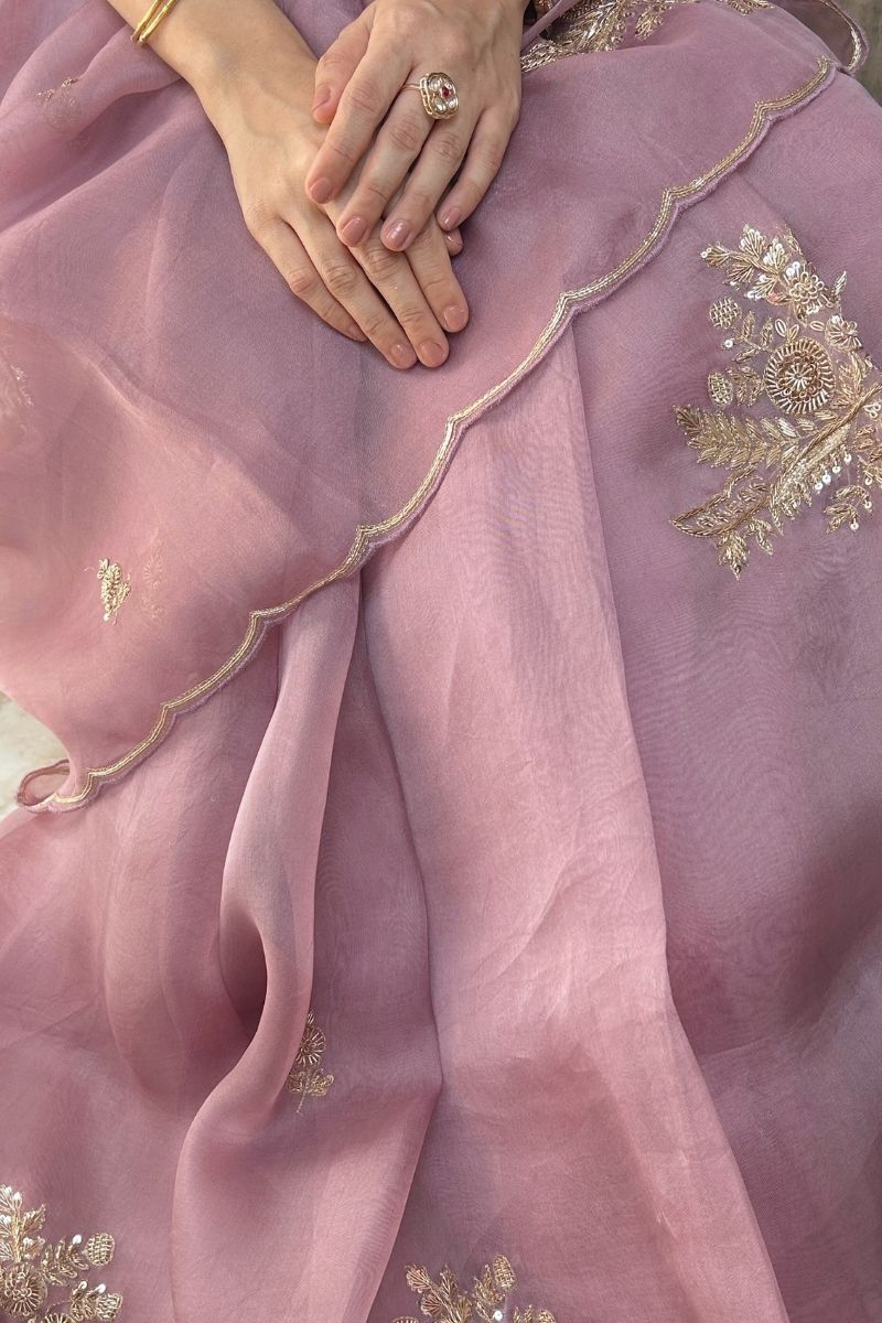 Accentuated with refined detailing along the pallu and border, the embroidery adds elegance without overpowering the lightness of organza. A timeless piece that blends traditional craftsmanship with contemporary softness, perfect for intimate celebrations and elegant festive occasions.
